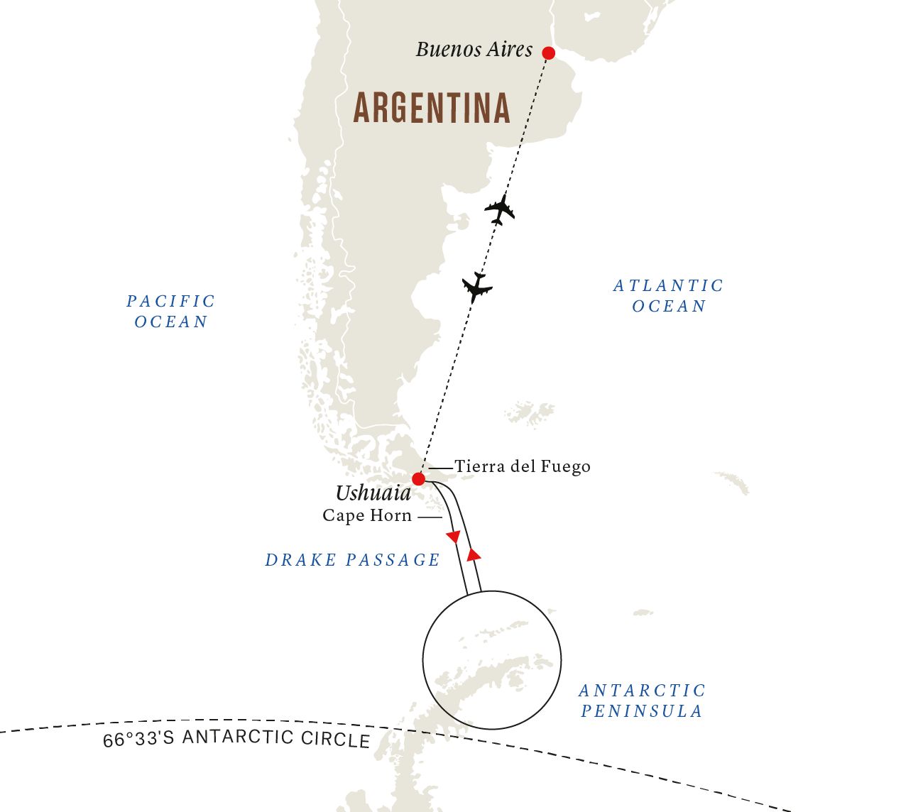- a Buenos Aires és Ushuia közötti repülőjegyet turistaosztályon oda-vissza